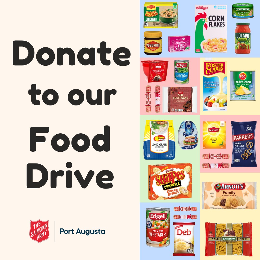 We are collecting nonperishable food for Salvos Christmas Hampers, at both Foodland and Coles this Saturday between 9am and 1pm in Port Augusta.
