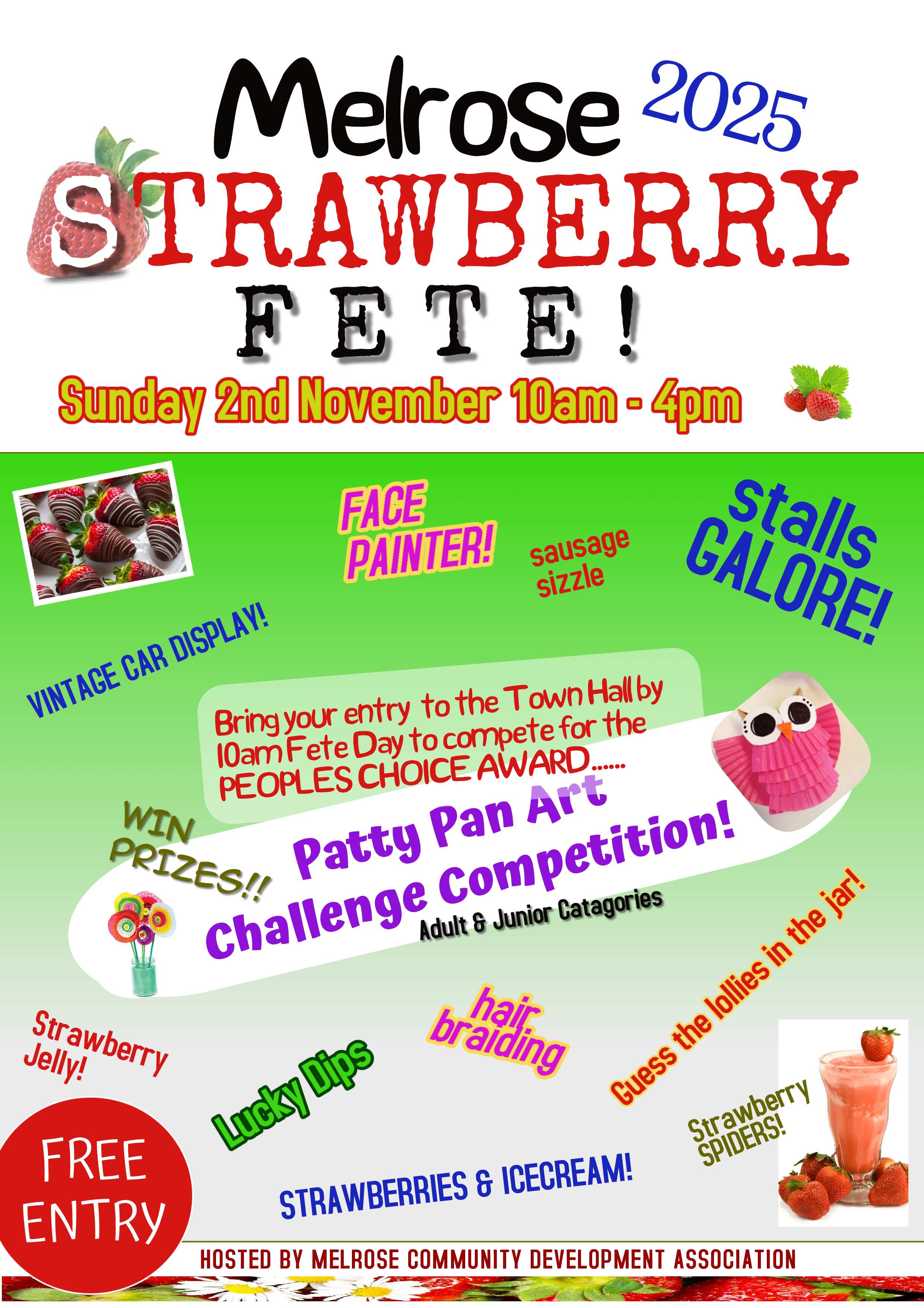 🍓 Dont miss the sweetest event around. Enjoy stalls galore to start your Christmas Shopping, have your face painted, hair braided, taste the strawberrys and ice-cream and other delicious local treats, lucky dips for the kids, and check out the shiny vintage car display .Plus, unleash your creativity in the Patty Pan Art Challenge Competition—make anything you like using patty pans and bring it along on the day to enter by 10am! 🗳️ Not entering? No worries—vote in the People’s Choice Award and help pick the winning Patty Pan masterpiece. 🏆 Prizes to be won, laughs to be had, and plenty of creations to admire!