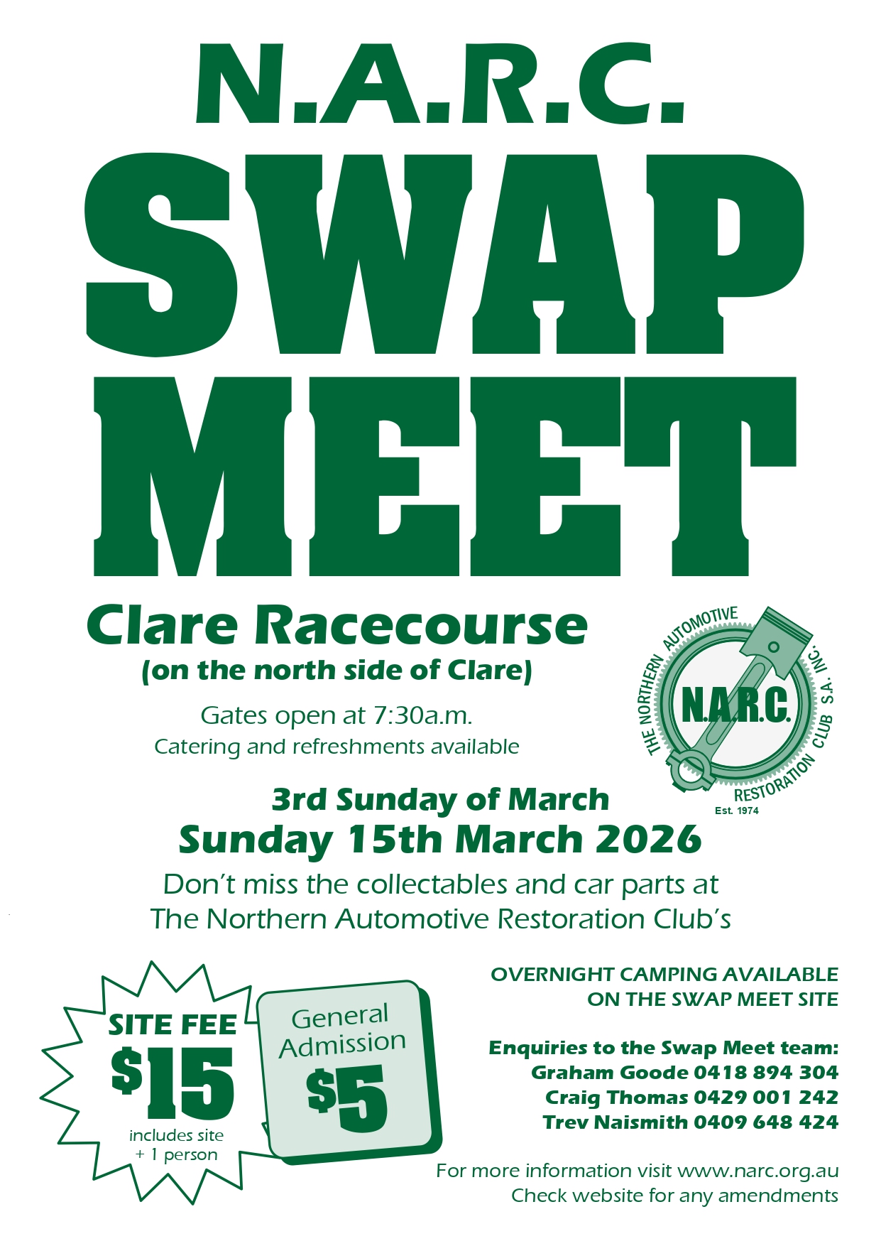 N.A.R.C Swap Meet Clare Sunday 15th of March – Clare Racecourse Gates open at 7.30am Catering and refreshments available Back to Community Events Advertisement Date Mar 15 2026 Expired! Time 7:30 am Cost $5-$15 More Info Read More